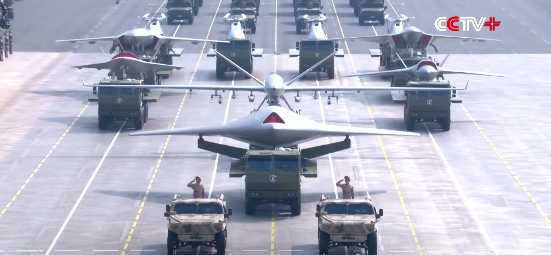 But are the paraded UAVs real? The ‘detailing’ visible on the UASFs—including very real-looking engine nozzles, access panels, landing gear, and EO sensors—suggest either an actual prototype/demonstrator, or an especially elaborate mockup. The smaller CCAs, however, don’t seem as detailed. The UAVs all have 53-series serial numbers associating them with a PLA UAV Brigade stationed at Hotan Airbase in Xinjiang province.