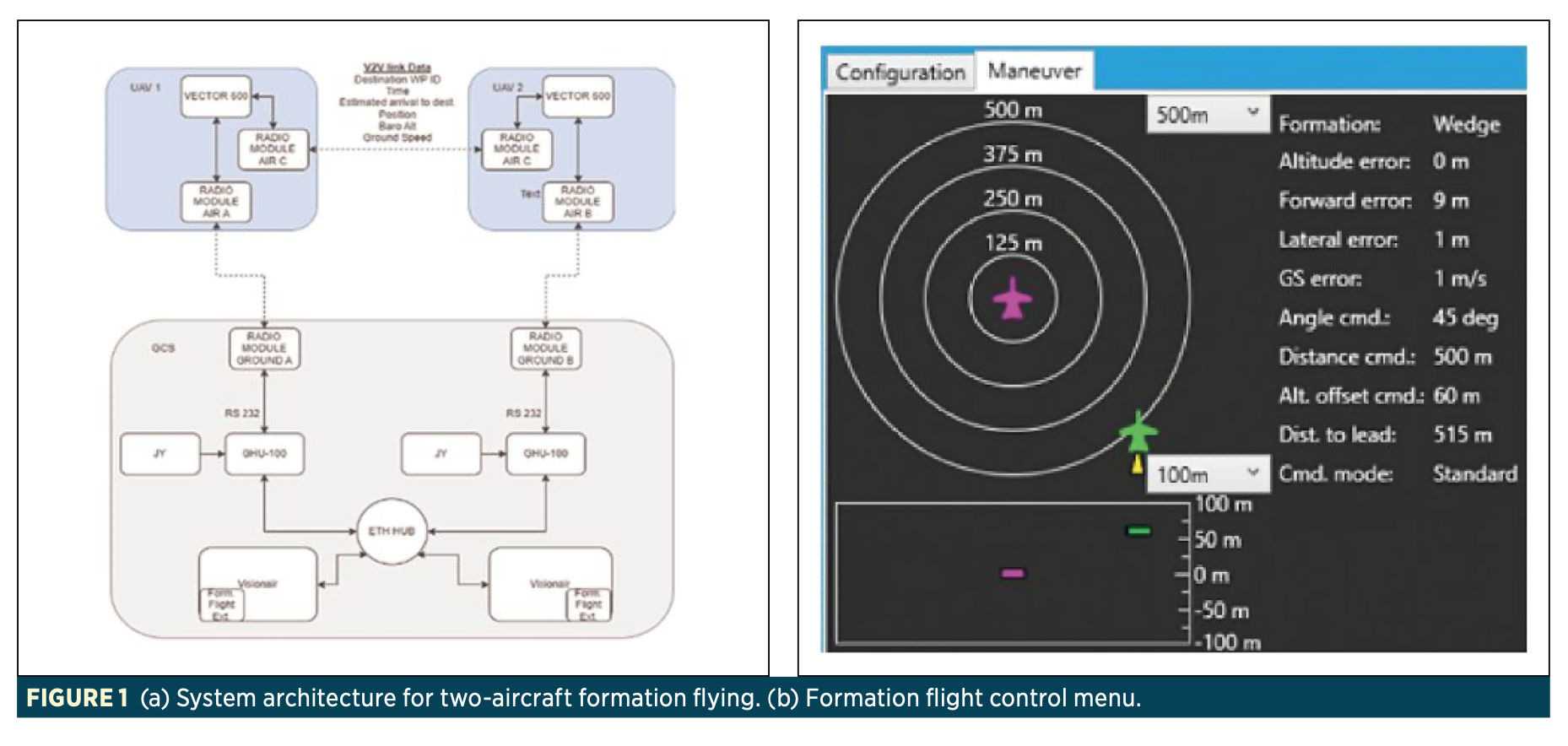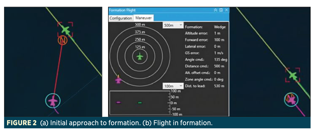 The operator has access to a dedicated interface from which different formation types, such as “wedge” or “fighting wing,” can be selected and activated. This interface also enables monitoring of aircraft behavior through a visual menu (Figure 1.b), thereby enhancing operator situational awareness. From that point onward, the VECTOR FCS flight control system autonomously manages both the convergence into formation and its maintenance, significantly reducing operator workload.
