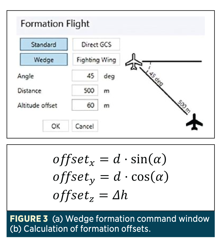 For example, in the case of the wedge formation (Figure 3.a), the input parameters include an altitude offset, a formation angle, and an inter-aircraft distance (Figure 3).