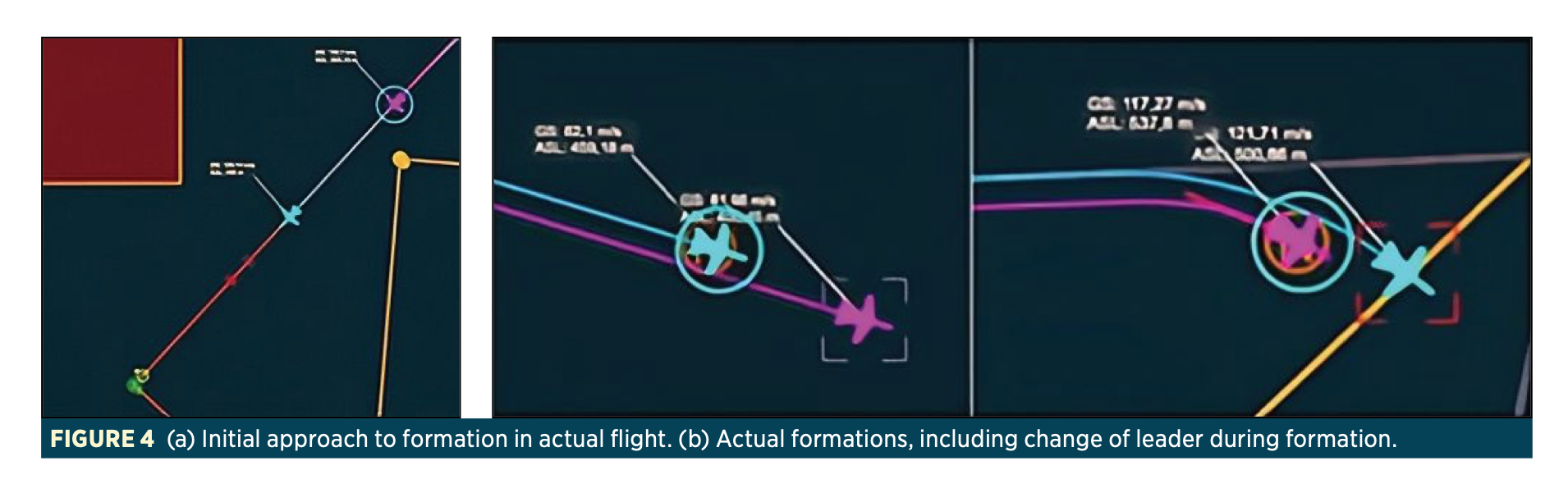 During these tests, the system’s capability to maintain stable formations was confirmed, even during dynamic maneuvers and leader changes. Functional formations were observed with minimum separations of less than 200 meters between aircraft, depending on platform speed and maneuverability.